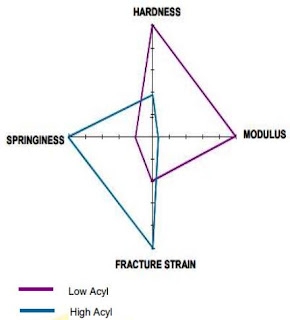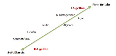 Low acyl gellan gum gels have a firm, brittle texture. Adding a high acyl gellan gum reduces the brittleness. By varying the ratio of these two forms of gellan gum, a wide variety of textures can be obtained. Blends of low acyl and high acyl gellan gum can match the texture of other hydrocolloids. By varying the ratio of low acyl and high acyl gellan gums it is possible to obtain textures close to those of carrageenan and gelatin gels.