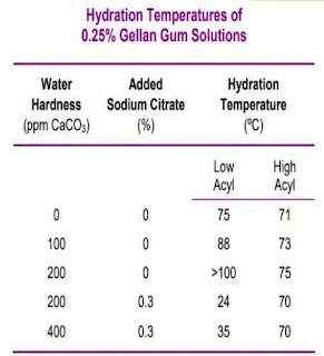• Concentration of ions in solution will affect the hydration temp. such as calcium , Sodium • Low acyl gellan gum requires a temperature of 75 ℃(1670F) to fully hydrate the gum.• High acyl gellan gum hydrates between 70℃ and 80 ℃(1580F and 1760F) even in relatively high ion concentrations